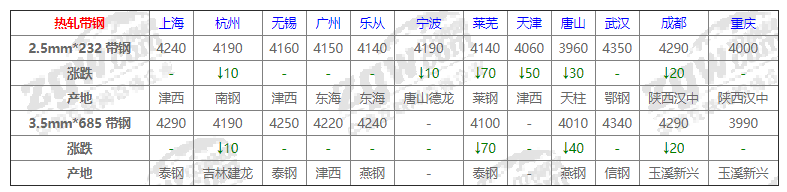 今全国热轧带钢弱势下跌,幅度10-70。整体期钢窄幅波动,从价格表现来看,有部分商家积极推涨,主流价格相对平稳,在买涨不买跌的规律下,近期价格或持稳个涨;